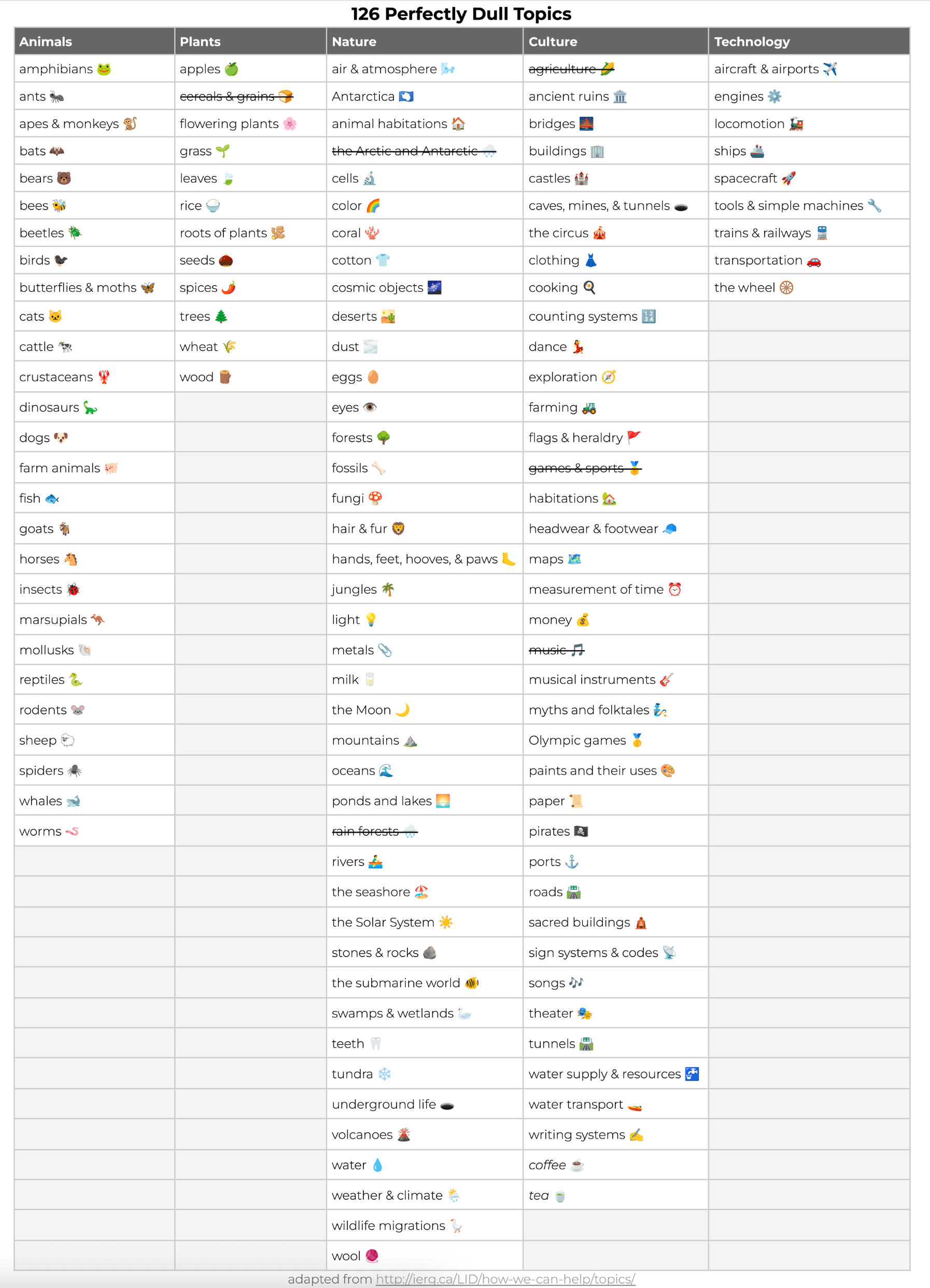 Topics will be drawn during the LiD Opening Ceremony.Below are the "perfectly dull topics" we'll be drawing your random topic from...Q: Ack, I can't stand this much randomness! Can't you give me some control?Yes! But just a little bit ;) On your signup form, you can ask us to select from two of the five columns e.g., Plants and Nature.
